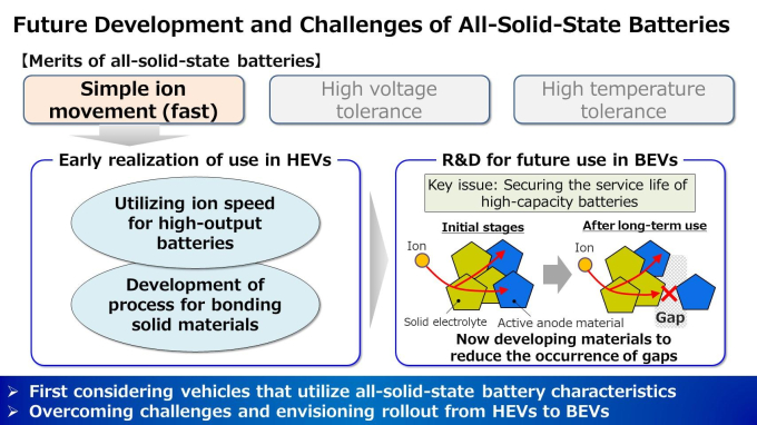 대신 토요타는 현재 개발 중인 전고체 배터리를 전기차가 아닌 하이브리드에 먼저 적용하는 것으로 계획을 수정했다. 토요타가 출시하는 하이브리드 자동차에 기존 목표대로 2025년 이내에 전고체 배터리를 넣는다는 입장이다. 토요타가 내세웠던 목표 시점은 동일하나 그 대상이 전기차에서 하이브리드로 바뀐 셈이다.