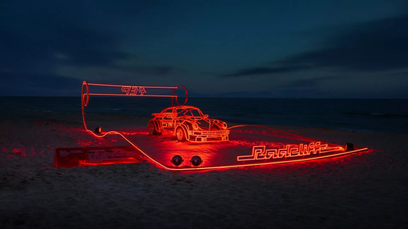 모래사장 위에 덩그러니 놓인 또 른 전시에서는 모래 위를 질주하는 타이칸과 먼지구름을 형상화한 구조물을 묘사했다. 다양한 색상으로 화려하게 물든 먼지구름은 관람객에게 환상의 세계로 이동시킨다는 메시지를 담고 있다.