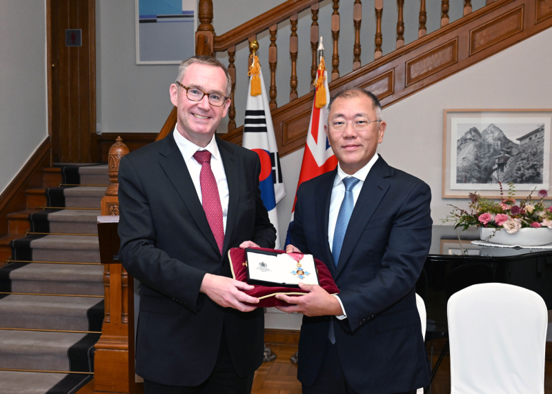 현대차그룹은 14일 서울 중구 주한 영국 대사관에서 열린 대영제국훈장 수훈식에서 정의선 회장이 대영제국 지휘관 훈장(CBE)을 수훈했다고 밝혔다. 영국 찰스 3세 국왕을 대신해 콜린 크룩스(Colin Crooks) 주한 영국 대사가 정의선 회장에게 훈장을 전달했다.
